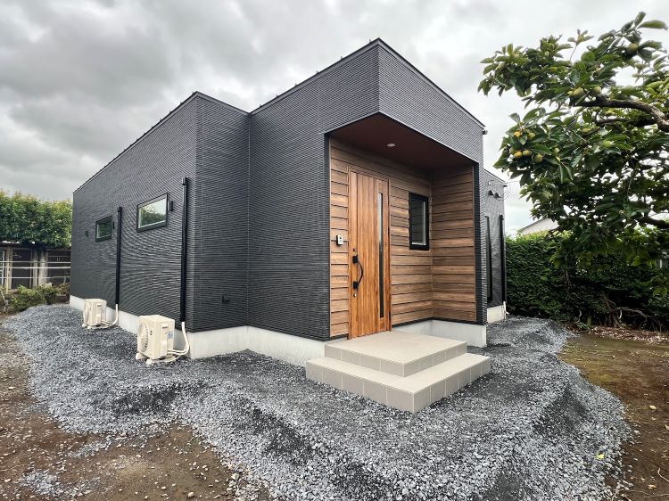 外壁には、ブラックをベースに玄関回りにシダータイプのラップサイディングを採用!
