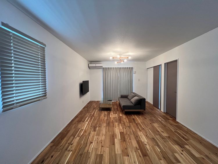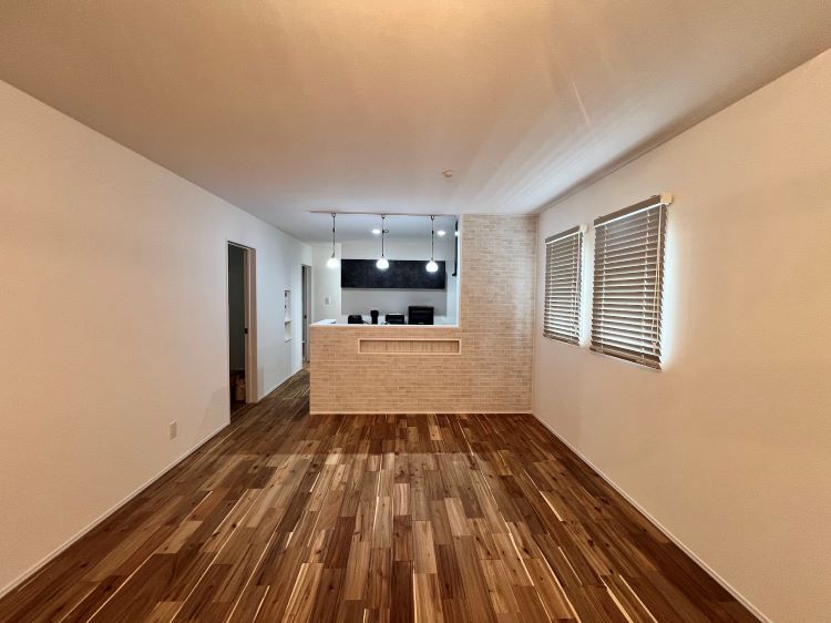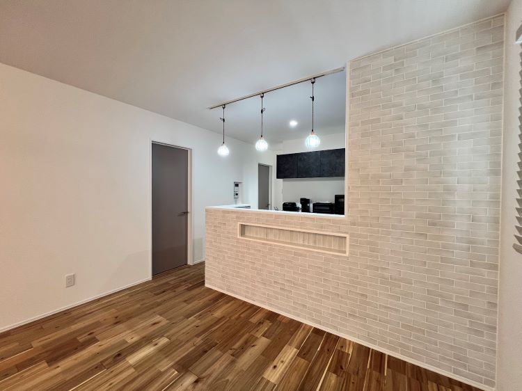 室内には温かみのある無垢床で仕上げ、キッチン腰壁部分にはアクセントとしてタイルで仕上げております!