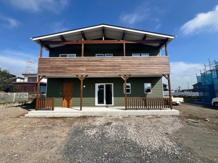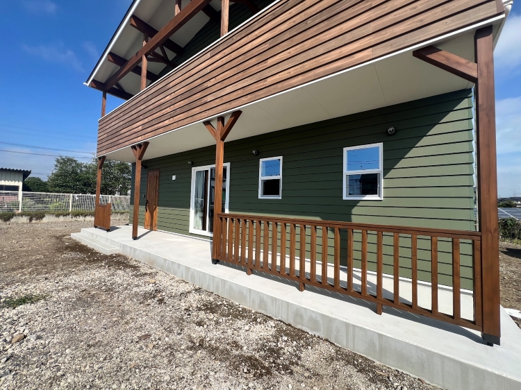 外壁には、特徴的な深緑色のラップサイディング、アクセント部にシダータイプを採用!
