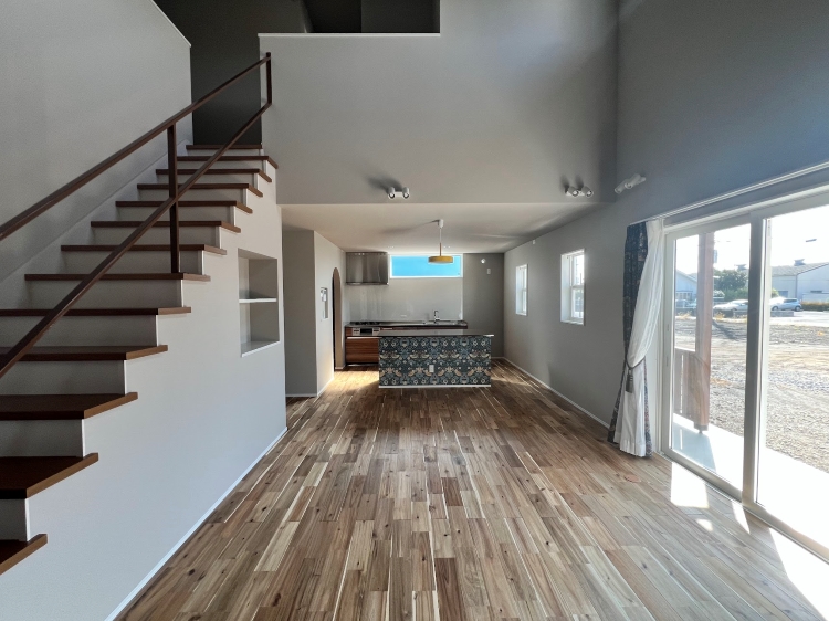 リビングにについては開放感溢れる吹き抜けにリビング階段を組み合わせた空間へ。