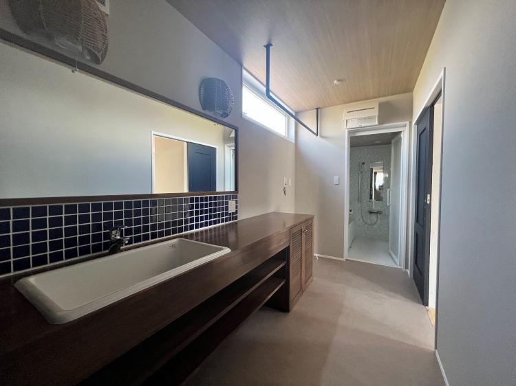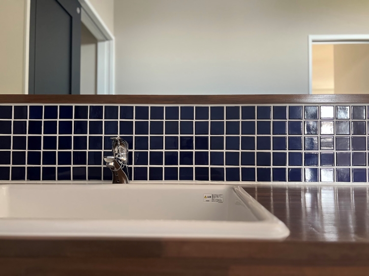 洗面台にはこだわりの造作洗面に御支給いただいた可愛いブルーのタイルを張り上げております!